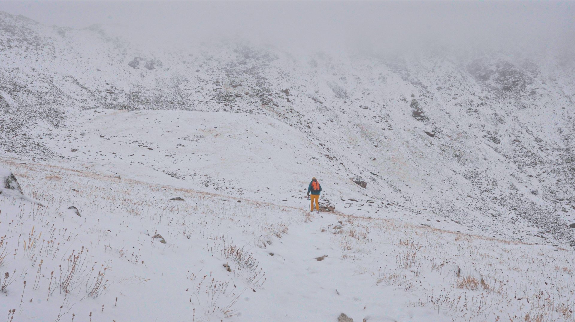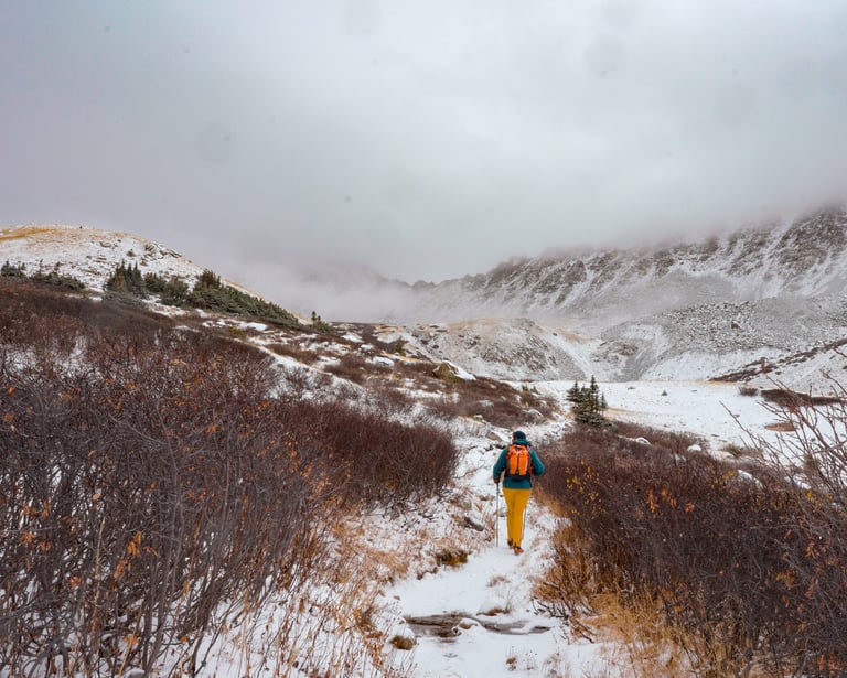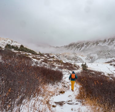 Above treeline, snow began to fall. At first it was light, then steady, and soon it was covering the trail. The higher I climbed, the more difficult it became to stay on route. There were moments I had to stop, check my GPS, and reorient myself — reminders that conditions can turn a clear path into a maze.