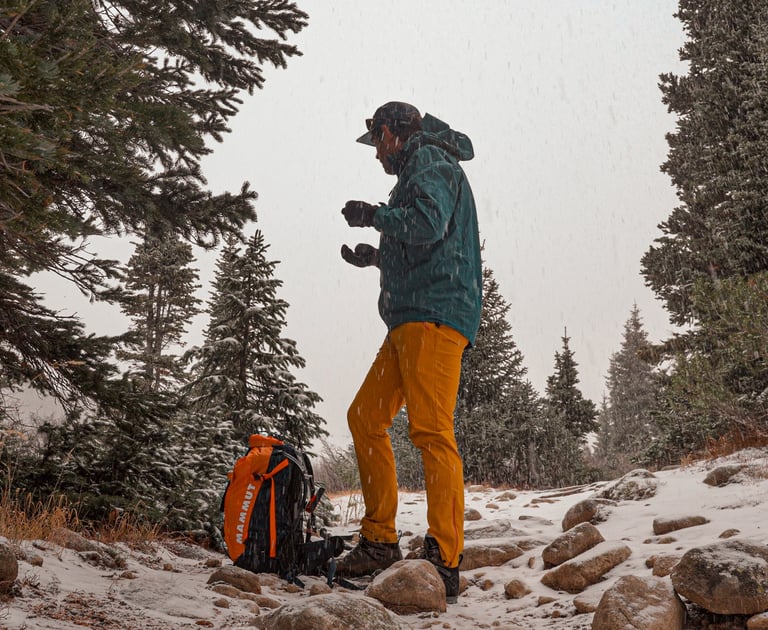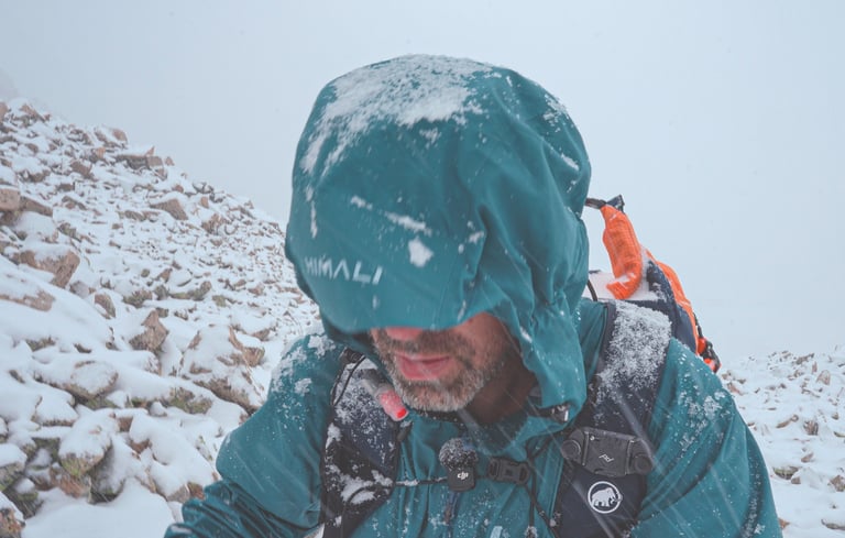 Shell: HIMALI Monsoon Hardshell Jacket and Pants — waterproof and windproof protection that saved the day above treeline.